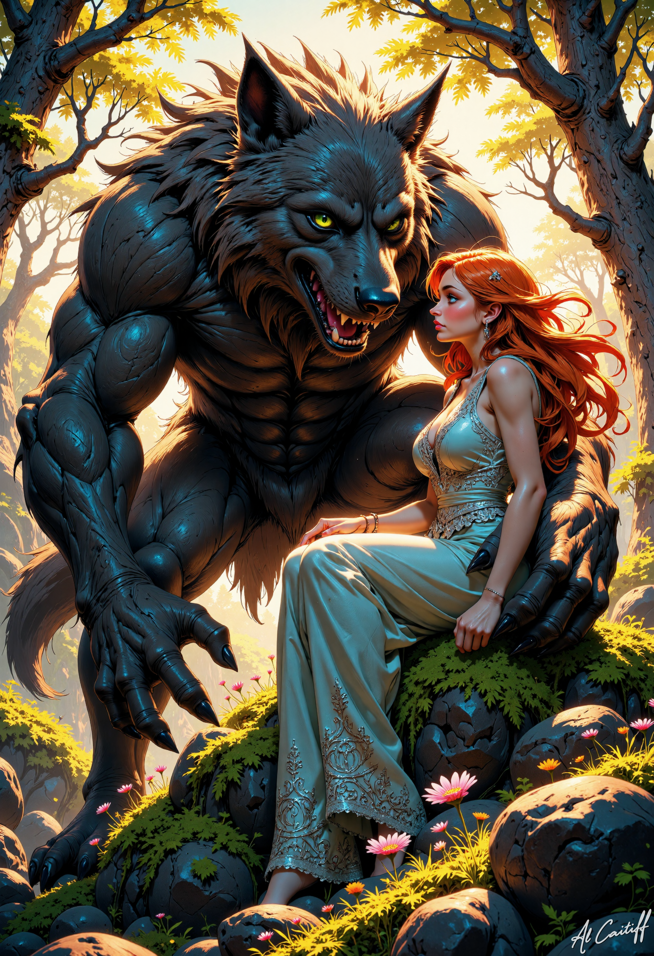 Extreme low-angle shot, 20mm fisheye lens with pronounced barrel distortion, intense motion blur on foliage, very shallow f/1.4 depth of field. A scene bathed in warm golden tones, set amidst a misty, primeval forest. A towering, hulking werewolf, its body a mass of razor-sharp, dark grey fur, sits atop a moss-covered boulder, its piercing emerald eyes fixed intently on a young woman with fiery, copper-red hair, who sits at its feet, wearing a flowing, pale blue gown with intricate, silver embroidery. The woman's slender fingers are intertwined with the werewolf's, as if in a gesture of trust or submission. The werewolf's massive paws rest on either side of the woman, its claws extended, but not menacing. The air is filled with the sweet scent of blooming wildflowers, and the soft, golden light of the setting sun casts long shadows across the forest floor., MysticComic, comic book style, CreeepyCuteMagic<lora:Flux/creeepycutemagic-000012 - version ER.safetensors:0.5:0.5> <lora:CustomFlux/MysticComic.safetensors:0.5000000000000001:0.5000000000000001>