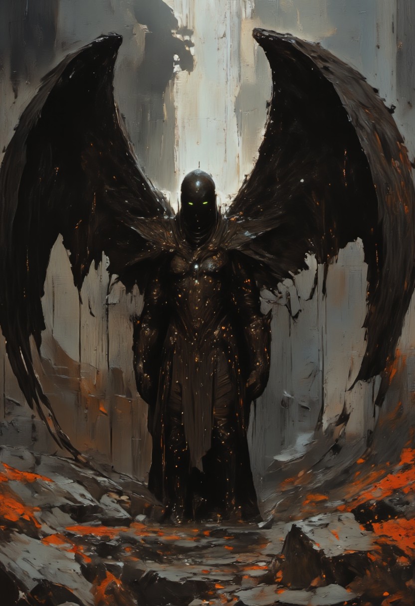 (Anime style, OBxiaoxiang) A dark angel stands, her large black wings stretching outward, their glossy, feathered texture highlighted by dim, cold light. Her face is completely obscured by a black veil, adding a sense of mystique and foreboding. She wears a shoulderless, glossy latex top and a high-waisted black skirt, showcasing gothic avant-garde fashion from Gareth Pugh’s "Noir Abyss" collection. The outfit seamlessly blends futuristic design with fetish-inspired elements, exuding dark elegance and sophistication. (Hyper-realistic full-body portrait, akin to Peter Lindbergh's style) High contrast enhances the reflective sheen of the latex and the deep blacks of her wings. The background features a stone wall overgrown with crimson flowers, adding depth and texture to the scene. Gloomy clouds loom overhead, but the glowing petals and sparkling armor create a powerful visual contrast, symbolizing beauty and danger. (In the style of Jed-clrfl) The intense use of light and color fills the atmosphere with an electric energy, amplifying the surreal and mystical mood. Subtle noise creates a grainy, vintage texture, while hyper-realistic detailing in the fabric, wings, and shadows amplifies the surreal, ethereal feel. The haunting silence and meticulous realism lend the image a dramatic, almost photographic depth, merging gothic high fashion with a cyberpunk, otherworldly presence.