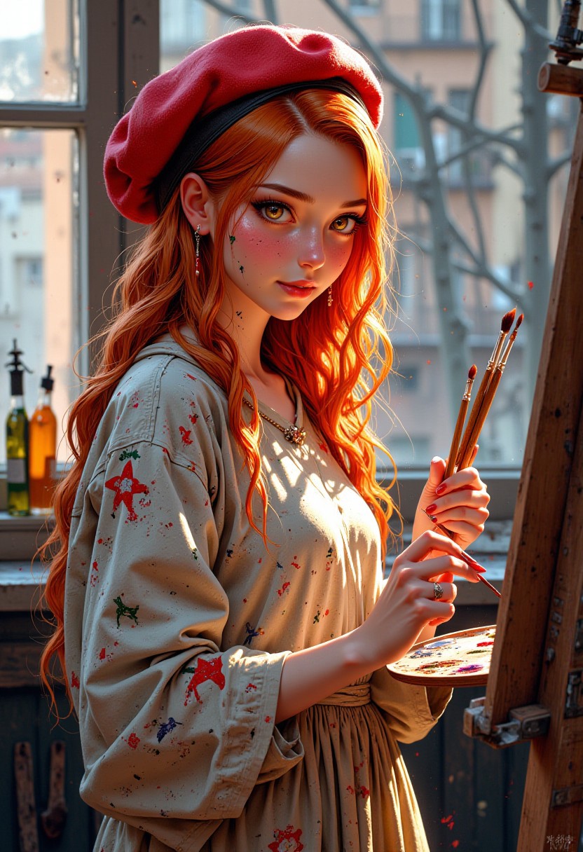 a funny and sweet red-haired girl in a red beret, with a palette and brushes in her hands, standing at an easel in the artist's studio, covered in spots of paint, paints her self-portrait, bright sunlight, soft pastel tones, photorealism, extremely detailed images of the highest quality, with the smallest details, (Masterpiece: 1.5), (the best quality: 1.5). elaboration of the smallest details, (((Overdetalization))), 8k detail, (highest quality image: 1.5), elaboration of the smallest details. dynamic side angle, sfw