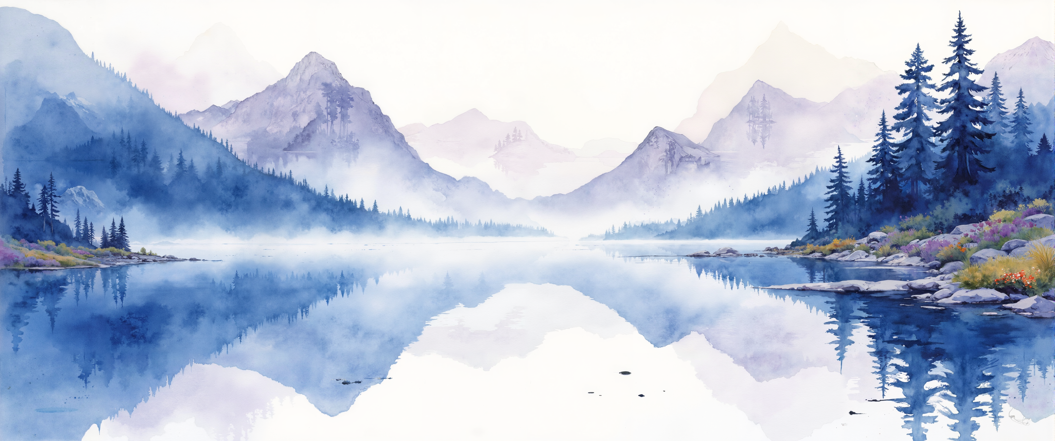 A gentle cascade of watercolor pigments blending into a misty alpine lake, reflecting towering pines and distant peaks. Soft, bleeding edges create ethereal transitions between sky and water, with translucent layers of cobalt blue dissolving into violet shadows. The rough texture of cold-pressed paper interacts with pigment, creating luminous highlights where water pools and delicate dry-brush details where it recedes. Loose, confident brushstrokes define the shoreline, while wet-on-wet technique creates soft, diffused reflections that shimmer with morning light. Tiny splashes of cadmium yellow and burnt sienna dance through the composition, defining wildflowers that catch first light along the misty shore. Masterful color harmony between cool and warm tones, with controlled granulation in shadow areas revealing the subtle texture of handmade paper beneath. A serene, atmospheric study of mountain tranquility captured in the distinctive translucent glow that only watercolor can achieve. <lora:ck-charcoal-drawing-000014:0.3> <lora:RM_JamesJean_v0.5:0.3> <lora:Illustration concept V1:0.3> <lora:zyd232_Ink_Style_Flux1D_v1_1:0.4> <lora:flux_dev:1>