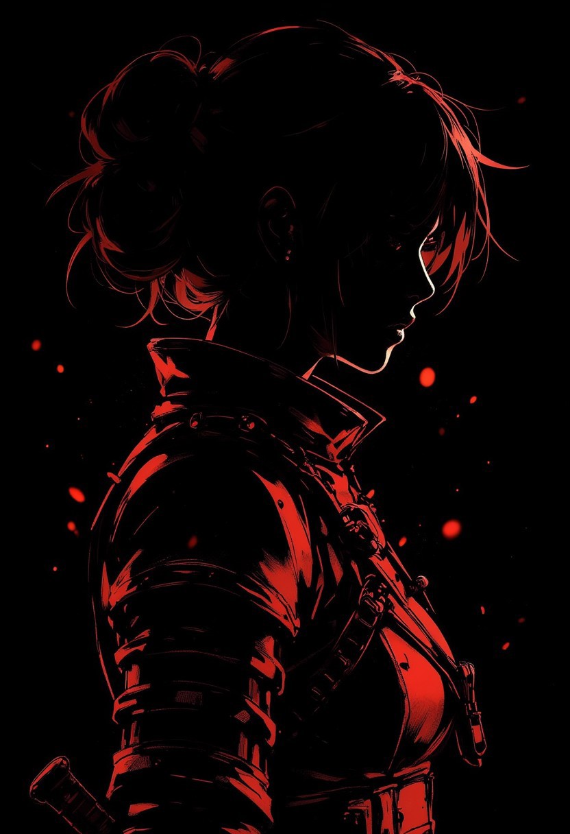 in the style of ck-mgs, nistyle, Special Ink-drawing mode, intricate linework with expressive contrasts, Mh1$AgThS2, Silhouette Art, magnificent, image of female warrior in samurai red leather armour, silhouetted, chiascuro, dark background, directional light