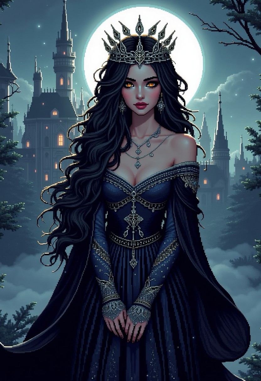 pinkpixelicious, A regal woman with onyx-black hair streaked with silver, adorned with an intricate crown resembling the phases of the moon. Her piercing golden eyes glow beneath dark lashes, and her deep plum lips contrast against her porcelain skin. She wears a floor-length gown of shimmering black and navy silk, embroidered with celestial patterns. Behind her, a grand gothic palace emerges from the mist, lit by an eerie, glowing eclipse.
