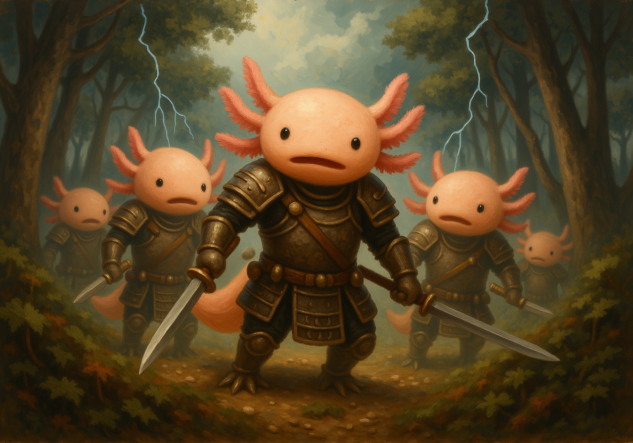 A dramatic oil painting with warm-toned brushwork of anthropomorphized axolotls with simplified rounded features plush faces with dot eyes and soft pink feathery gills. axolotl warriors in ancient armor, battling in a stormy forest, lightning illuminating the scene<lora:axolotl_oil_painting.safetensors:1.0:1.0>