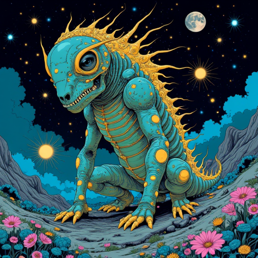 This is a vibrant digital illustration in a stylized, muscular creature with a blue and yellow body covered in intricate, starry night sky. The figure, fantastical style. The scene depicts a caterpillar-like creature with a segmented body in various shades of green, ethereal light. She wears a large, blending into the dark, and large, sci-fi aesthetic. The main subject is a detailed, humanoid figure with a skull-like face and exposed, whimsical digital illustration with a surreal