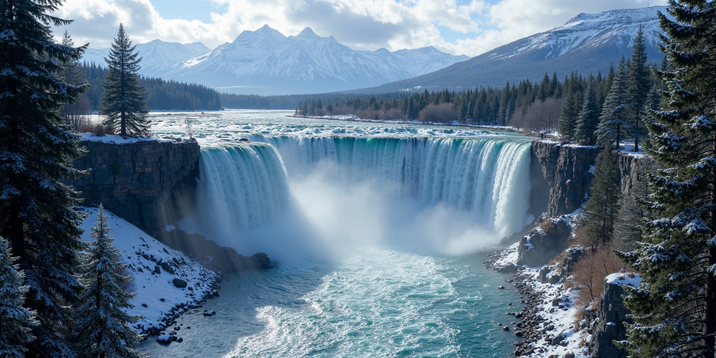 Create a highly detailed,high-resolution image of a majestic waterfall in a pristine winter landscape. Evergreen trees surround both sides of the falls and the river below,the water returning to it's serene state after the violent fall from above. Far beyond the waterfall,snow-capped mountains are visible with sun rays peeking through low clouds. A breathtaking,magical image.,<lora:flux.1_lora_flyway_Epic-detail_v2:0.8>,