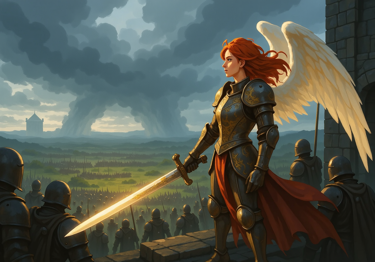 painterly style with soft cel-shaded lighting and detailed stylized rendering of A red-haired angel with windswept hair stands in a medieval-style fortress atop a craggy hill, her long plate armor adorned with golden engravings. She grips a massive greatsword, its blade glowing faintly with divine energy, as she overlooks the battlefield below. Her wings, larger than most, seem to shimmer with light as she spreads them wide, preparing to take flight. Around her, soldiers in tattered armor look up in awe, as if they are witnessing the arrival of a divine protector sent to turn the tide of battle. In the distance, enemy siege towers loom under a stormy sky.<lora:story_game_art.safetensors:1.0:1.0>