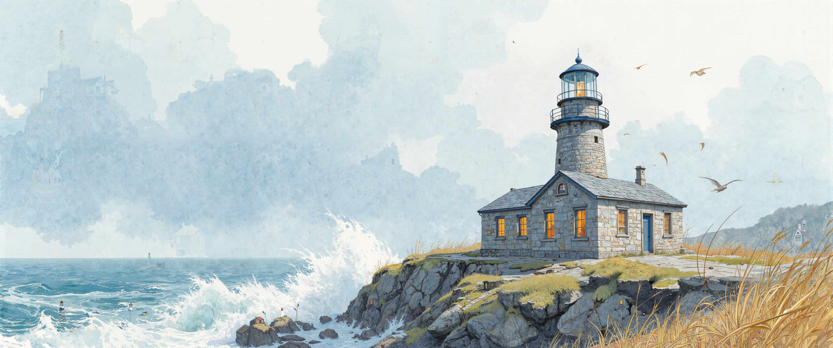 A gossamer-light watercolor study of a weathered lighthouse keeper's cottage at the edge of a windswept cliff, where translucent washes of cerulean and indigo blend seamlessly with the misty horizon. Delicate wet-on-wet technique creates soft, bleeding edges where sea meets sky, while controlled diffusion establishes the textured stonework of the cottage. Loose, confident brushstrokes define wild coastal grasses in the foreground, their golden-green hues bleeding slightly into the handmade cotton paper's visible texture. Pale washes of rose and amber suggest the first light of dawn breaking through morning fog, casting luminous reflections on dampened surfaces. The cottage windows glow with warm ochre, creating delicate points of contrast against the ethereal background. Masterful negative space preserves the paper's white for sea spray and lighthouse beam, while gentle salt textures create atmospheric mist rising from the turbulent waters below. Transparent layers build depth while maintaining the medium's characteristic luminosity and ephemeral beauty. <lora:ck-painterly-fantasy-000017:0.2> <lora:boFLUX Double Exposure Magic v2:0.2> <lora:RM_JamesJean_v0.5:0.6> <lora:Ganin_II:0.3> <lora:flux_dev:1>