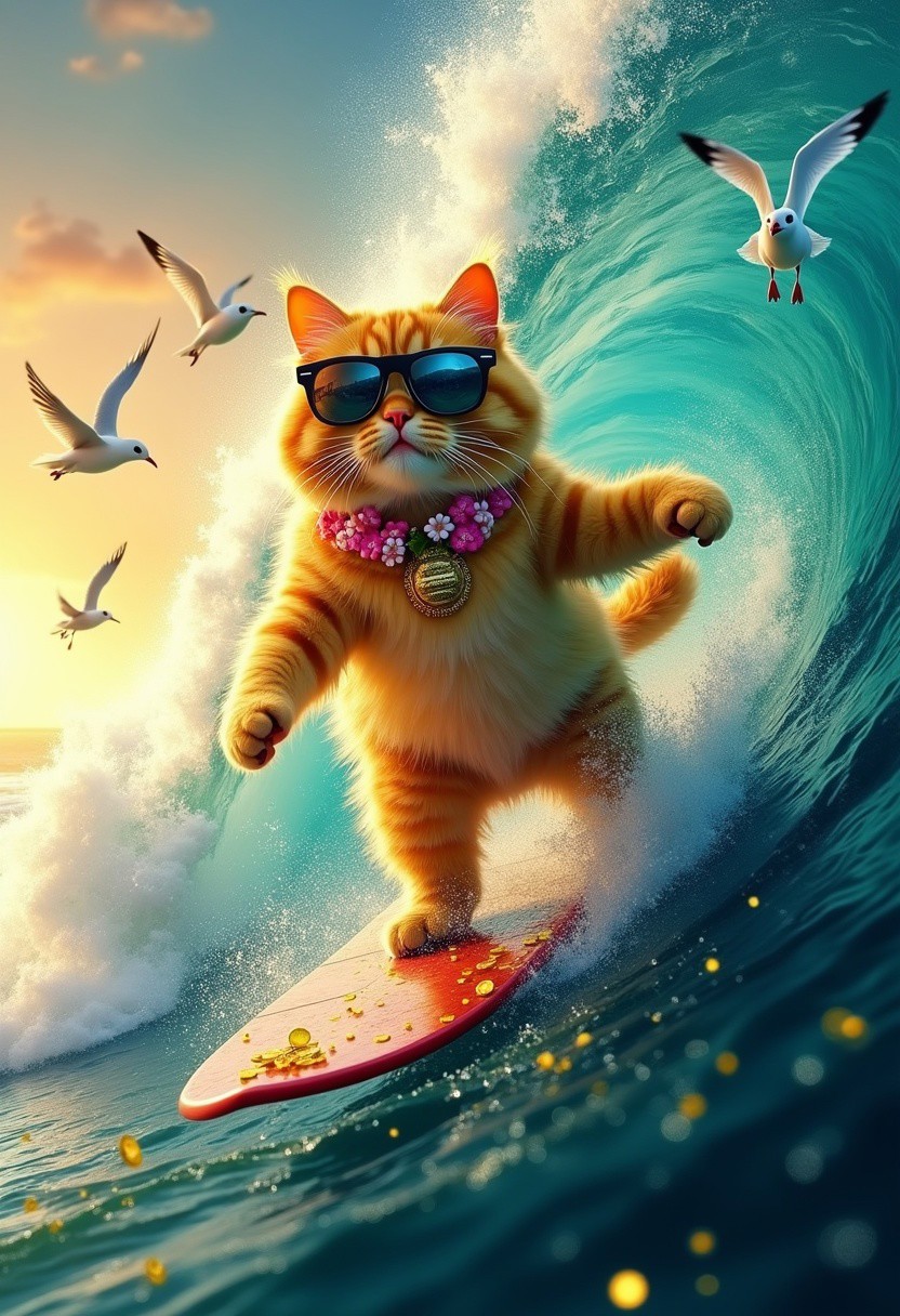 A bright yellow wealthy Persian cat, wearing oversized mirrored sunglasses and a tropical flower necklace, balances expertly on a surfboard, cutting through the crest of an enormous wave. The water is a swirling mix of blues and greens and some golden coins in it, foamy spray frozen in time as it arcs around the cat's hands. A small crowd of bewildered seagulls watches mid-flight, their heads tilted in disbelief. The horizon stretches endlessly in the background, where the setting sun casts a golden glow across the oceanas surface. funny and happy colors <lora:XRSTYLE_FLUX:0.5><lora:black_fantasy_1.0:0.5><lora:FluxDFaeTasticDetails:0.7>