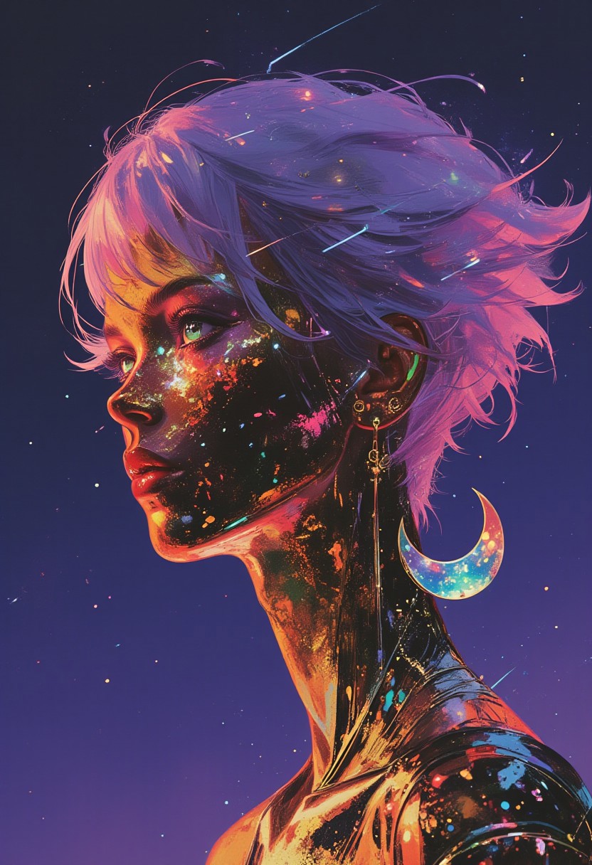 Chromecore, against a deep violet background, a close-up side profile of an adult woman with liquid gold skin shimmers with a polished metallic finish. Her glowing emerald green eyes emit an ethereal light, while bioluminescent electric blue tears stream down her cheeks, intensifying the surreal atmosphere. The chrome-like surface reflects neon magenta and cyan highlights, creating a dynamic interplay of light and shadow. Intricate geometric engravings subtly glow across her metallic skin, emphasizing her fusion of cybernetic and organic elements. A crescent moon earring dangles from her left ear, blending mysticism with futuristic aesthetics. Her short, asymmetrical hair, infused with iridescent purple strands, shifts hues as light refracts off its metallic sheen. A translucent obsidian faceplate conceals her mouth, adding an air of mystery, while gold circuit-like veins pulse faintly beneath her skin, suggesting an advanced fusion of humanity and machine. The rich violet background, infused with soft glowing embers of magenta and teal, heightens the dreamlike, cybernetic aura of the composition.