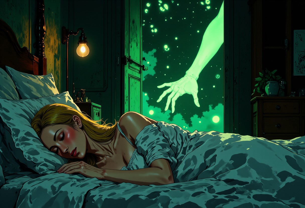 A highly detailed illustration of a woman asleep in her bed as an apparition sneaks out of her closet. The woman is asleep in the foreground of the shot. She is lying in bed asleep with her head on her pillow. She is in deep slumber and peaceful. Her golden hair loosely spills on the pillow. She is covered only to her waist, revealing a white satin nightgown. The door to her closet is slightly ajar, and a green luminescence creeps from it. An apparition is spilling from the closet. The apparition is surrounded with a thick cloud of mist, but a ghostly glowing hand with five fingers reaches from the mist toward the sleeping woman. Vague outlines of demons can be seen within the room, and in the depths of the closet. The mood is dark, tense, and foreboding. It is a masterpiece of unrivaled quality. It is unsigned. Perfect hand. Highest quality, best quality. VibrantlyDark style.