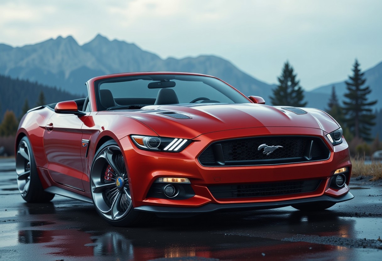 photo masterpiece, realistic, modified futuristic like a new ford mustang, convertible, tuned, shiny, impressive, on a mountain road above cluds, 8bit
