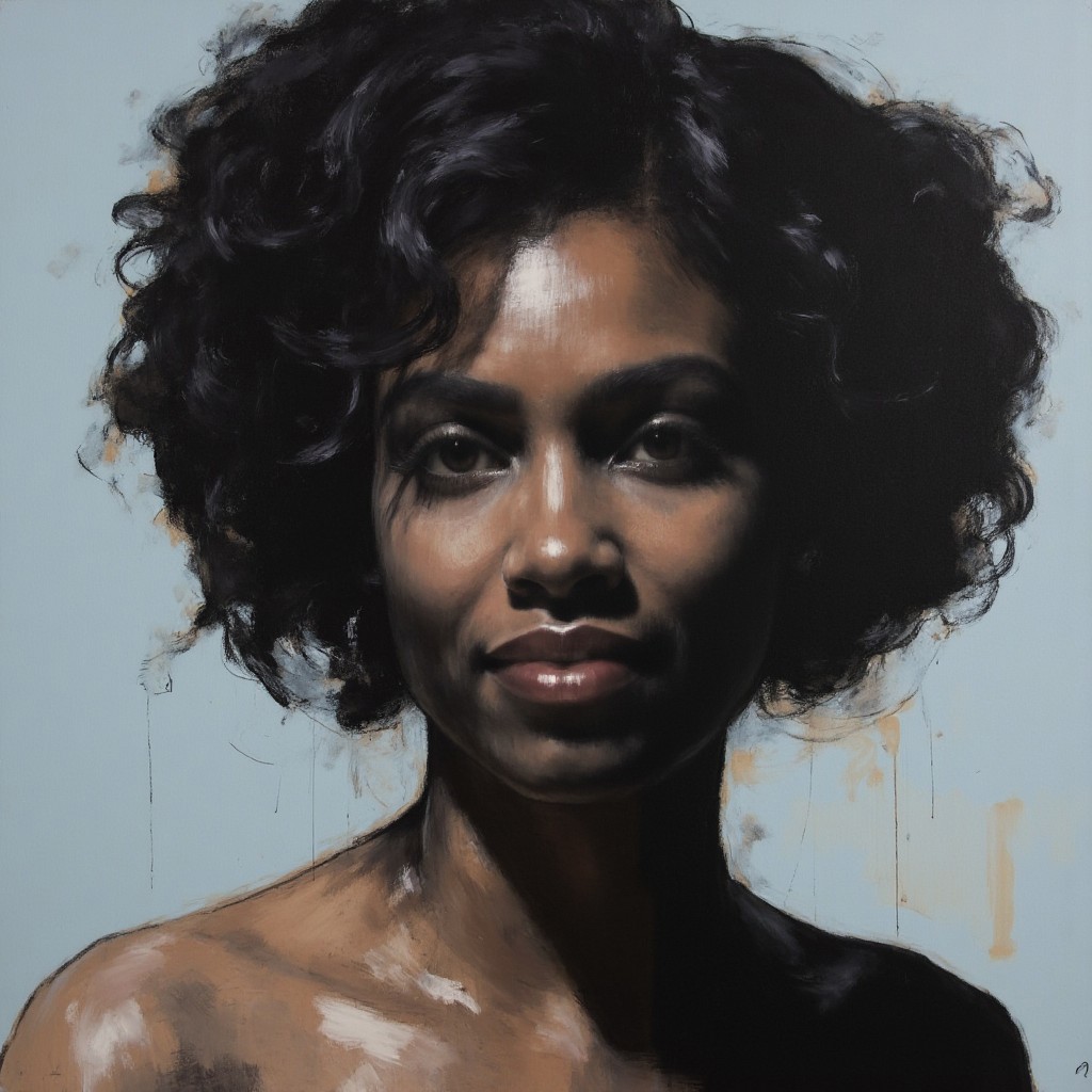 Art by Mark Demsteader. A close-up portrait of a black woman, captured in a monochrome, abstract style from a portrait camera angle. the subject, a black woman with dark skin and dark afro hair, is positioned in the middle of the image, looking directly at the viewer with her large, expressive brown eyes. her expression is frowned and contemplative, with a slight smile on her lips. she appears to be in her early thirties, with her hair styled in loose curls framing her face. the background is a soft, muted blue and beige color, blending seamlessly with the subject's features, creating a sense of depth and texture. the image is high quality, with no visible jpeg artifacts, and a watermark in the bottom right corner.