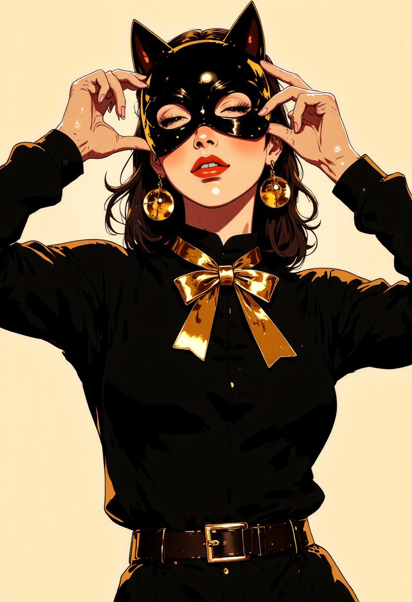 A close-up, half-body portrait of a woman with a serene expression, her eyes gently closed. She wears a sleek, form-fitting black long-sleeved shirt that hugs her upper body, paired with a tight black mini skirt and leggings that showcase her figure. The outfit's all-black palette creates a striking canvas for her golden accessories. In her hands, she holds a glossy black catwoman mask with distinctive pointed ears, positioned next to her head as if she's just removed it from her face. Her fingers delicately grasp the edges of the mask, showing off her perfectly manicured nails. With the mask removed, her full face is now revealed – smooth skin, defined features, and closed eyes suggesting a moment of peaceful vulnerability or contemplation. Around her neck gleams a shiny golden bowtie that catches the light brilliantly, complemented by a thick golden belt cinched at her waist and large golden bell earrings that frame her face. The contrast between the matte black of her clothing and the reflective gold of her accessories creates a luxurious, high-fashion aesthetic. The background is simple and unobtrusive, ensuring all focus remains on her face and the dramatic interplay between the black outfit and golden accents.