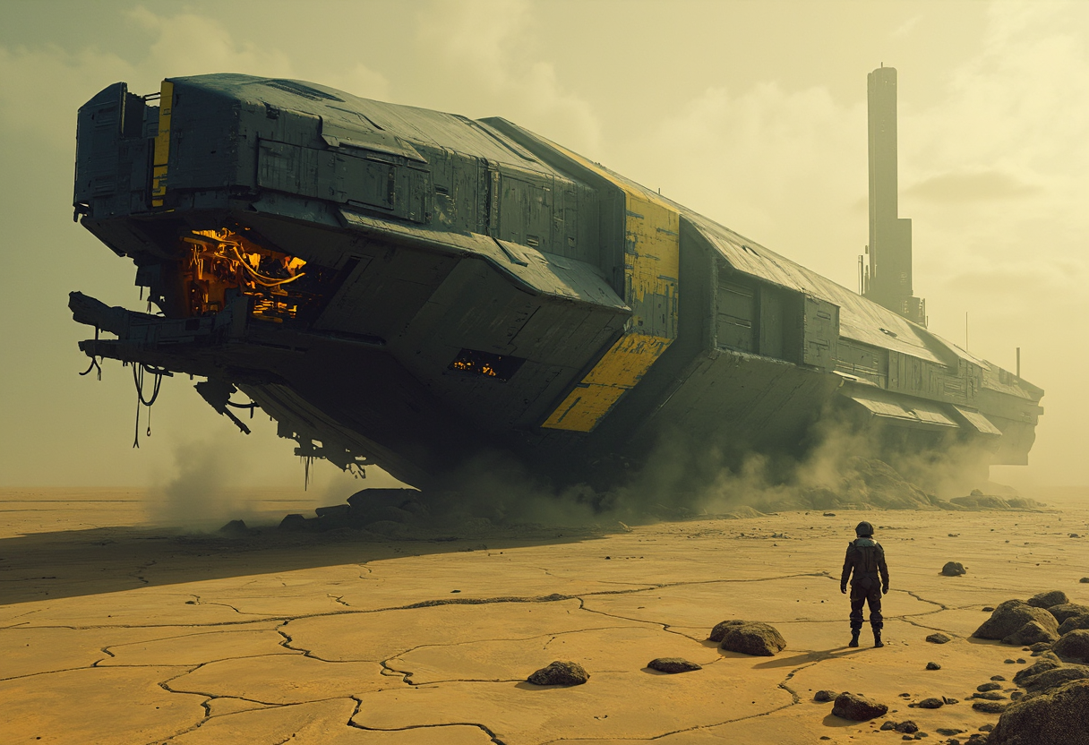 UNI_SCI_FI_CORE Muted yellow, gray, and black tones dominate the scene, evoking a dystopian, industrial atmosphere. Retro scan of an 80s sci-fi book, lofi, grainy, melancholic yet hyper-detailed, cinematic. A digital painting in the style of ck-js: A colossal, technologically complex spaceship lies stranded in the middle of a desolate, cracked wasteland. Its intricate, black-and-gray hull is battered and scorched, with sections torn apart, exposing tangled mechanical innards and fading yellow hazard markings. The ship looms over the barren landscape like a beached leviathan, its towering silhouette casting long, menacing shadows across the ground. Surrounding the wreck is a lifeless desert of fractured, dusty yellow and gray earth, dotted with scattered debris from the ship's catastrophic landing. The horizon is hazy, blending seamlessly into a dark, overcast sky, where storm clouds churn and faint beams of pale light struggle to break through. Cinematic lighting bathes the scene in a somber glow, with swirling dust and subtle volumetric effects emphasizing the sheer scale of the wreckage. The atmosphere is heavy with a sense of abandonment and decay, enhanced by soft shadows, shallow depth of field, and a gritty film grain that lends the image an aged, retro-futuristic texture. A haunting reminder of technological ambition lost to ruin.