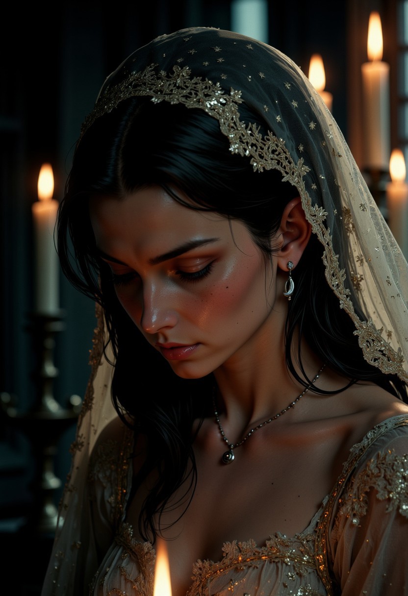 An atmospheric and powerful dark fantasy, natural organic and impressionist classical-style painting of a close-up head and shoulder portrait of a woman in a shadowy, candlelit room. Her face is framed by a delicate, sheer, laced veil that drapes over her forehead and falls to her shoulders, partially obscuring her features but allowing the soft glow of her eyes to shine through. Her eyes are downcast, filled with a hint of sadness, and her cheeks wet with tears that spilled down her from her eyes. Her lips are slightly parted, as if caught in a moment of vulnerability. She wears a silver earring in the shape of a crescent moon, glinting softly in the candlelight, and her long hair flows loosely beneath the veil, cascading over her shoulders. The veil is embroidered with tiny, shimmering stars that catch the light, adding a touch of ethereal beauty. The background is blurred, with hints of soft, glowing candles casting warm shadows over her skin, emphasizing the intimacy and emotional weight of the scene., (((ultra-realistic style))), realistic soft lighting, dark, eye-catching, atmospheric lighting, natural, shallow depth of field, (highlights: 0.8), high detail (dynamic, cinematic shot, film grain, bokeh, depth of field)