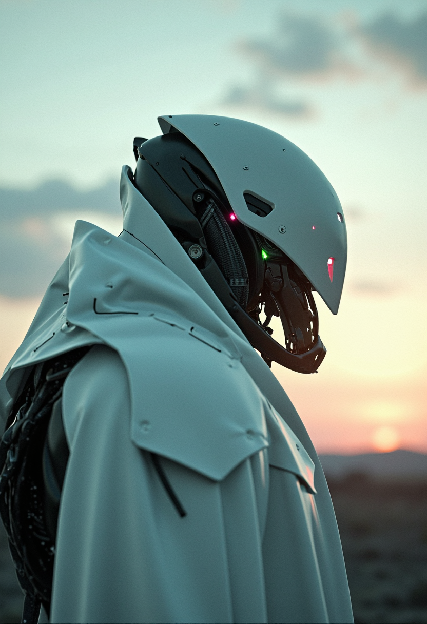 UNI_SCI_FI_CORE YFG-V1nt, Head Closeup, dark-mood-mod, a photo-realistic image, depicting a sleek armored mech-knight with exposed wires and intricate technical parts. A Future soldier in dynamic Pose. The scene is set at dusk, with the sky transitioning from a soft, pale blue to a deeper, cooler hue, and the horizon lined with wispy, scattered clouds. The dominant feature in the image is His mechanical mechanical edgy shoulder armor, jagged and broken resembling a translucent sss Planet, oversized and intricate, its translucent bleaked neon pink and Green surface and luminous translucent Material stark against the sky. dressed in a Armor with a long, flowing white robe that appears to be made of a dark, coarse translucent material, blending into the dark tones of the landscape. (raytracing:1.3), (ambient occlusion), (cinematic lighting:1.3), (chromatic aberration), (4K image quality:1.3), (sharp detail:1.3), (highly realistic:1.3), (dim warm cinematic lighting:1.3)