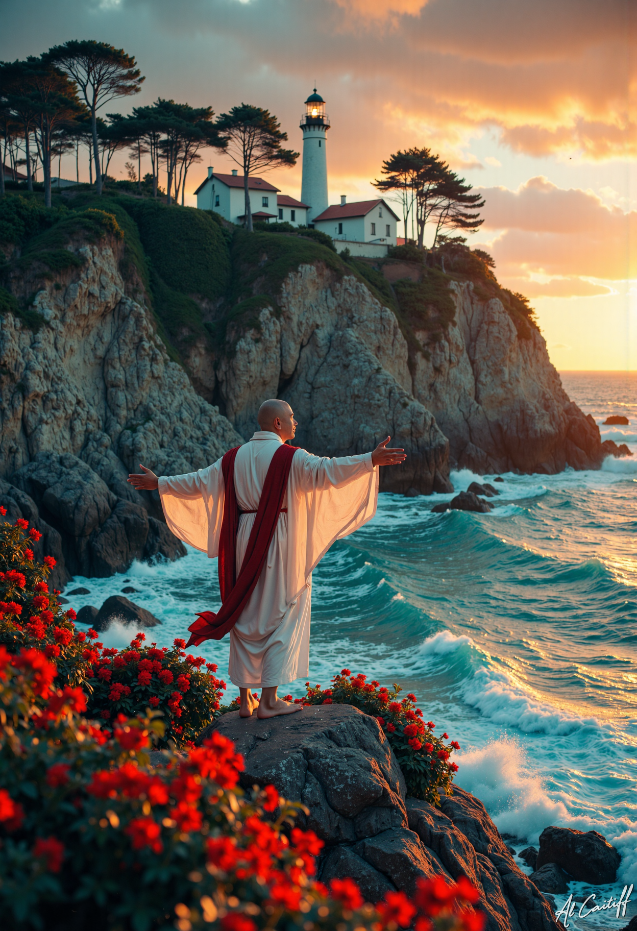 Low-angle shot, 35mm prime lens with minimal distortion, no motion blur, deep f/1.4 depth of field. Dramatic scene with warm sunlight. A man in a flowing white robe with a red sash stands on a rocky outcrop, arms outstretched, gazing at a lighthouse. The lighthouse emits a soft orange glow, contrasting with the cool blue sea. The man's skin glows with a faint ethereal light, and his eyes are a striking green. The rocky cliffs are adorned with vibrant red flowers, and the sea is a deep turquoise, with waves crashing against the shore. The sky is a gradient of warm oranges and cool blues, creating a serene yet intense atmosphere.<lora:CustomFlux/MysticRealism.safetensors:1.0000000000000002:1.0000000000000002>