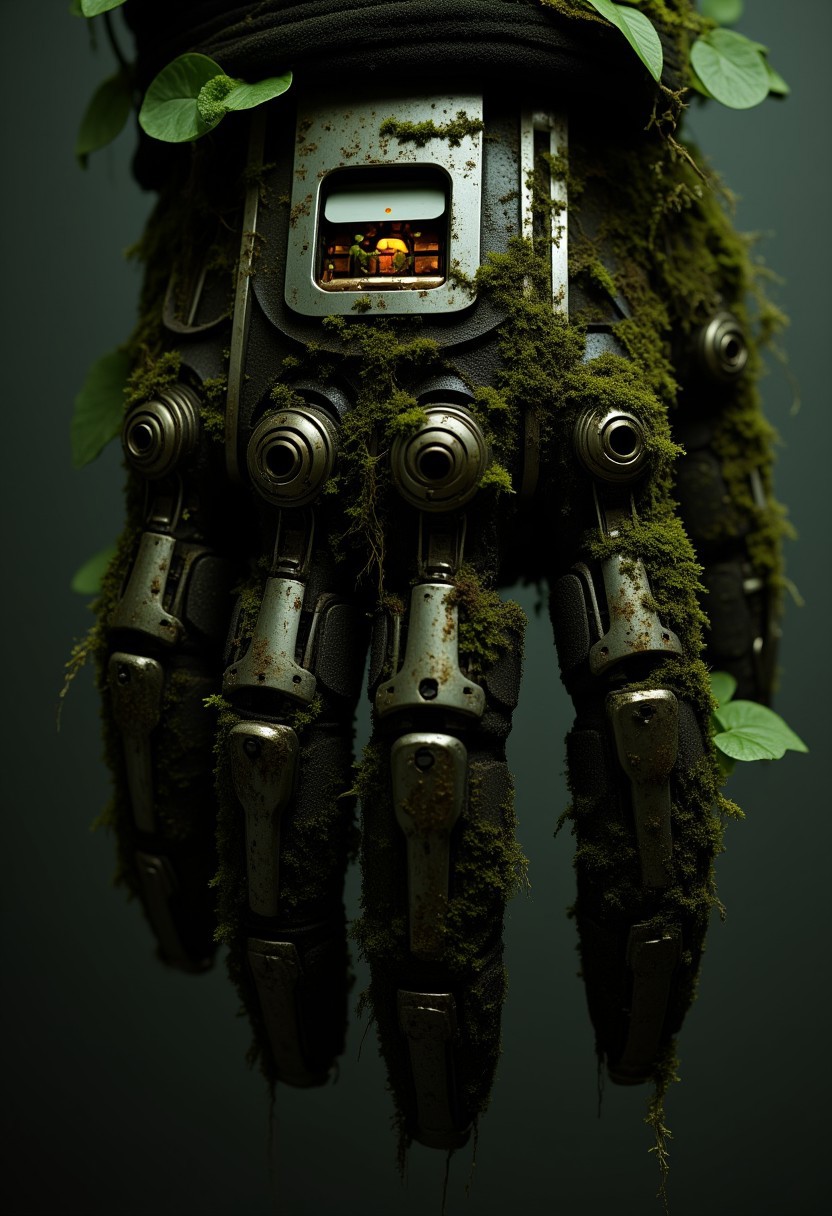 ajweathbo. A photorealistic Image of a weathered intricate designed mechanical Hand, its Joints and mechanical parts are weathered and overgrown with detailed realistic Moss and tiny leafs, atmospheric lighting, desaturated color graded