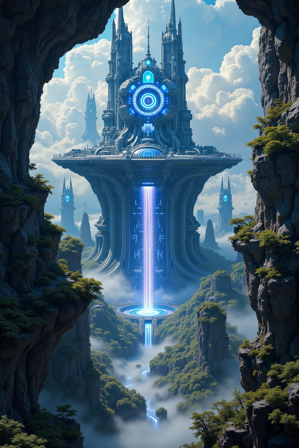 anm-frac of fractal pattern, spirals a sci-fi city with waterfalls from a huge tower realistic movie scene extremely detailed, ideal for wallpaper art <lora:anm-frac-v1-000022:0.9>