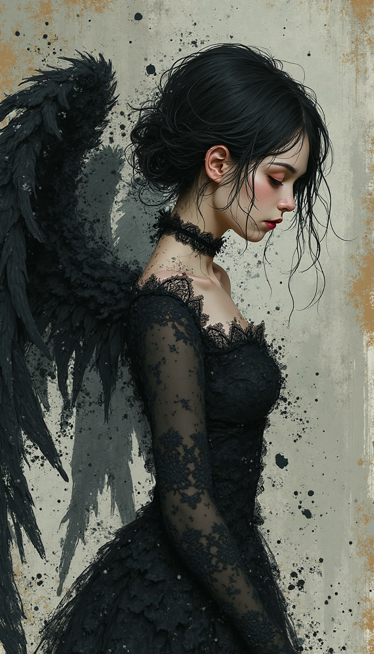 This is a digital illustration by artist Katsushika Hokusai, depicting a somber, ethereal female figure with dark, flowing hair and large, black wings. The woman has pale skin and a serene expression, with her eyes closed and lips painted red. She wears a dark, gothic-style dress with intricate lace and a high neckline, adorned with a black choker. The background is a mix of abstract, splattered paint in shades of grey and black, adding to the overall melancholic mood. The composition uses the rule of thirds, with the woman's face positioned in the upper third, drawing the viewer's eye to her expression. The image has a haunting, otherworldly quality, with a focus on contrasts between light and dark elements.