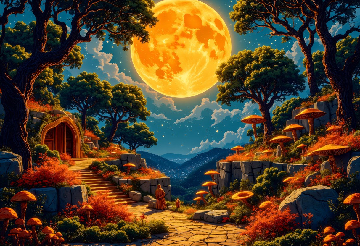 The Saffron Moonlight Sanctuary A luminous garden of cascading terraces, bathed in the warm glow of a massive, honey-colored moon. The ceiling is an open expanse of twinkling celestial threads, weaving delicate patterns across the sky. Gnarled fig trees, their branches entwined with floating orbs of silver light, grow alongside patches of glowing mushrooms and trailing ferns. The stone pathways, engraved with ancient constellations, guide visitors toward copper sculptures of ethereal beings, half-buried beneath the weight of time and vines. The air is filled with the scent of orange blossom, aged parchment, and a whisper of something cosmic, just beyond reach.