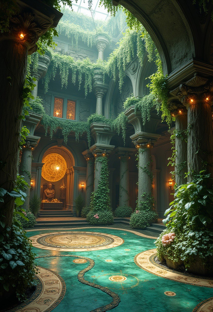 The Verdant Celestial Atrium A floating garden ballroom, where gilded vines and crystal flowers intertwine with massive brass astrolabes that slowly rotate in harmony with the stars. The floor is polished jade and dark oak, engraved with glowing runic constellations. Bioluminescent fungi, nestled in the cracks of ancient stonework, pulse softly with emerald and sapphire hues. Towering mahogany sculptures of celestial beings, overgrown with hanging ivy, stand along the walls, watching in eerie silence. The air carries the scent of rain-kissed moss, aged parchment, and celestial nectar.