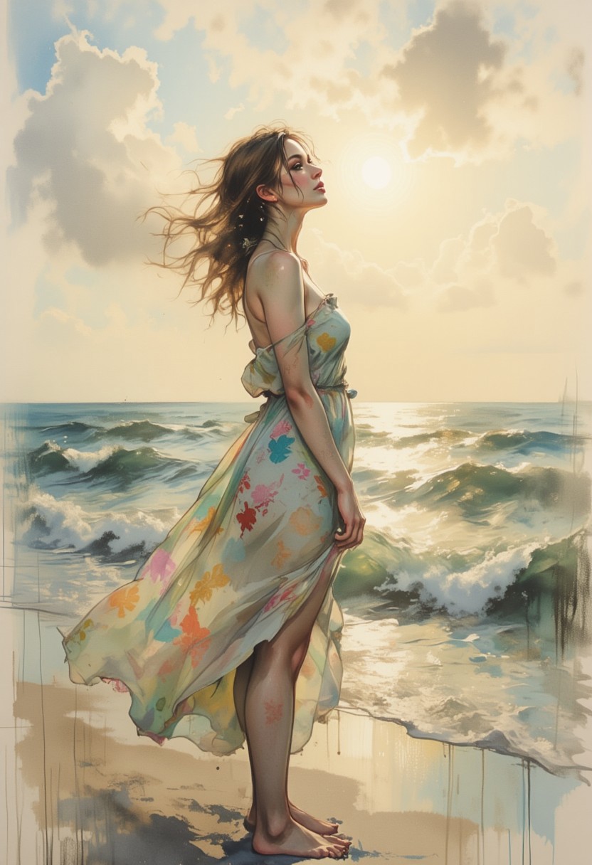 A dinkfsn style ink wash painting, OBxiaoxiang, Inkplash art on rice paper, sepia, henna , Silhouette Art, magnificent, inksplash poster art, closeup portrait, The sun generously gilded the shore, where the sea waves whispered a soft foamy embroidery on the sand. Against this backdrop, like an elegant statuette, stood the girl. Her light summer dress, the color of a sky gently blue after a spring rain, fluttered in the breeze as if the wings of a butterfly. The porcelain-white skin of her face acquired a pearly tint under the sun's rays, and the blush on her cheeks shimmered with the bright tones of a morning rose. The waves gently encircled her slender legs up to her knees in azure water, sometimes showering her hips with a cool breeze and leaving behind traces of rainbow foam on her skin. In her gaze, directed towards the horizon, there was a dreaminess that was offset by a spark of playful cheerfulness in her eyes. Her hair, golden like sunbeams, shimmered with all the colors of the summer sky, cascading down her shoulders in a soft wave. In her natural beauty blended the tenderness of the sea breeze and the hot breath of the sun, creating an alluring aura capable of drawing one into the boundless expanse of a fairytale summer.