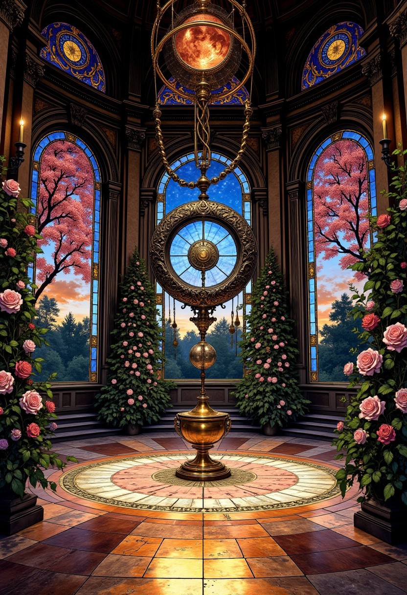 The Eclipse Rose Ballroom of Time’s End A timeless, dreamlike ballroom, where stained-glass panels shift through an eternal cycle of night and day, casting ever-changing patterns upon the polished brass floor. Dark roses with silver filigree petals bloom along twisting iron trellises, their scent rich with ancient magic. At the heart of the ballroom stands a massive, suspended celestial pendulum, its movements dictating the rhythm of the stars. The air is thick with the scent of twilight air, sandalwood, and crushed rose petals, evoking a feeling of eternal longing and celestial fate.