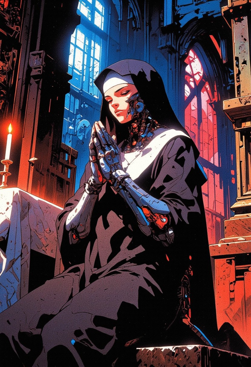 Medium Close-Up, Slightly High Angle, Dimly lit Gothic church interior, kneeling figure before a stone altar draped in worn velvet, dramatic shafts of blue and red light from stained-glass windows illuminate dust motes, flickering candles cast warm highlights on ancient stone pillars and vaulted ceiling lost in shadow, atmosphere of solemn reverence mixed with unsettling technological intrusion, A young cyborg nun, head slightly bowed, hands (one human, one sleek chrome cheetah-styled cybernetic arm with visible blue glowing wires and pistons) clasped tightly in prayer, wearing a traditional black and white habit adapted around cybernetics, silver cross pendant, serene yet conflicted expression with eyes closed, intricate metallic cheetah plating visible below waist, polished chrome and matte black plating with etched spot patterns, Cinematic lighting, chiaroscuro, volumetric light rays, 85mm lens, f/1.8 aperture creating shallow depth of field, subtle lens flare, hyperrealistic style, highly detailed, sharp focus on the character's face and upper body cybernetics.