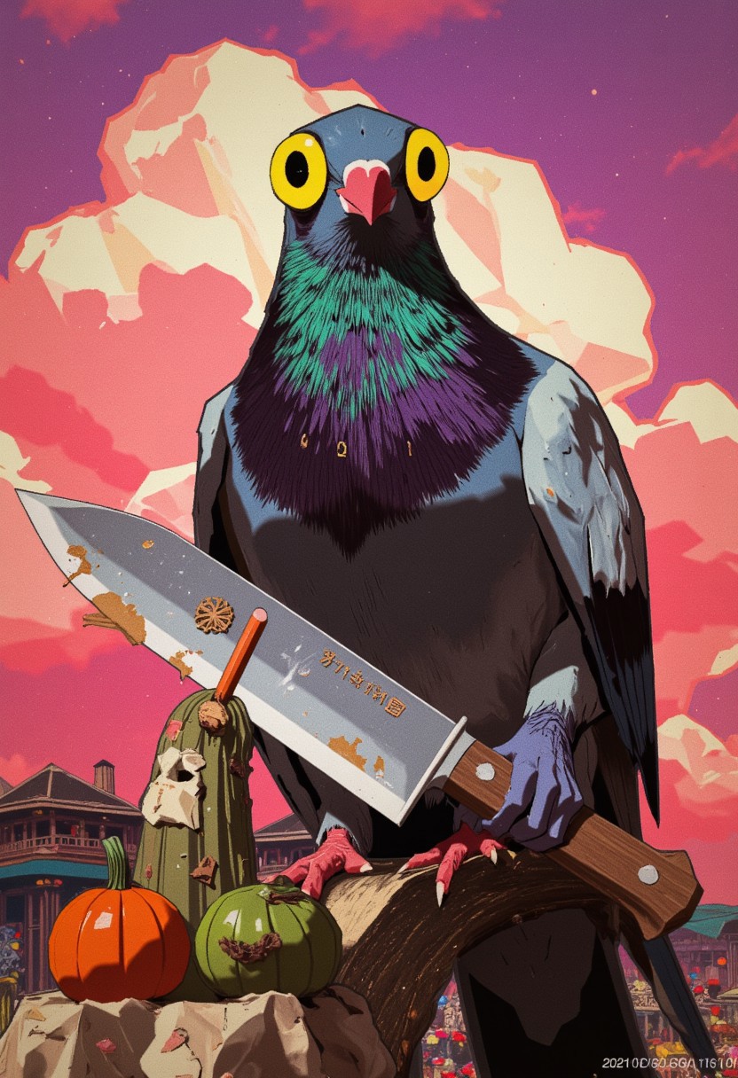 masterpiece, best quality, create a detailed oil painting in a dark fantasy style featuring a pigeon with oversized, bulging yellow eyes, staring intently at the viewer while holding a comically large knife. Incorporate noticeable pencil strokes to add texture to the artwork. The background should be a pink cloud, sunset, providing a contrasting backdrop to the whimsical yet intriguing scene. The artwork should be inspired by the Renaissance, showcasing realism and the qualities of portrait photography. Focus on creating a captivating and imaginative portrayal of this unique character, Cinematic, beautiful, vibrant, masterpiece, 32k, ultra HD, ultra-detailed, amazing quality, amazing artist, sharp edges, detailed textures, full view, atmospheric lighting, amazing visuals