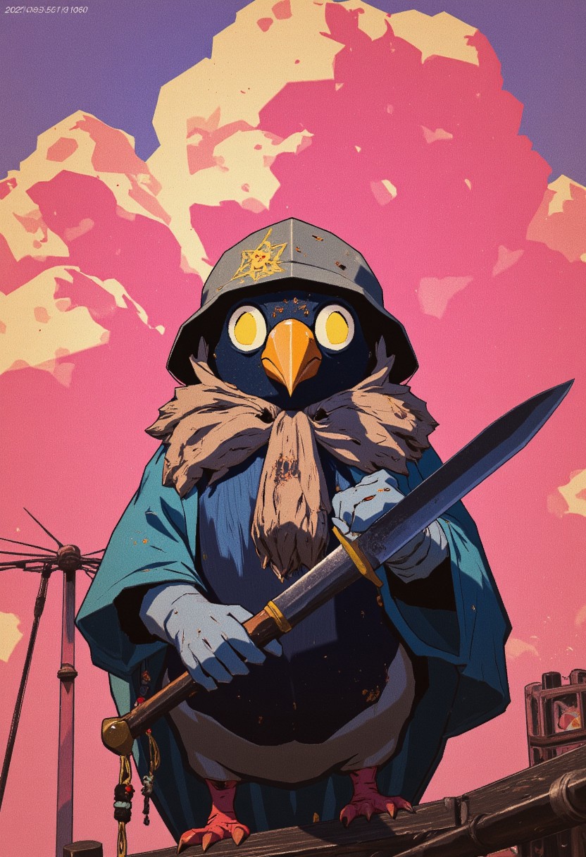 masterpiece, best quality, create a detailed oil painting in a dark fantasy style featuring a pigeon with oversized, bulging yellow eyes, staring intently at the viewer while holding a comically large knife. Incorporate noticeable pencil strokes to add texture to the artwork. The background should be a pink cloud, sunset, providing a contrasting backdrop to the whimsical yet intriguing scene. The artwork should be inspired by the Renaissance, showcasing realism and the qualities of portrait photography. Focus on creating a captivating and imaginative portrayal of this unique character, Cinematic, beautiful, vibrant, masterpiece, 32k, ultra HD, ultra-detailed, amazing quality, amazing artist, sharp edges, detailed textures, full view, atmospheric lighting, amazing visuals