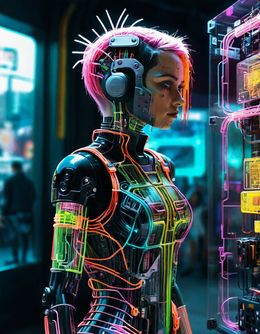 <lora:dare_cosplay_selfie:1> at the cosplay convention <lora:sdxl:1> solo, cyberpunk <lora:World_of_Glass_Filament:1> tiny neon glass filaments