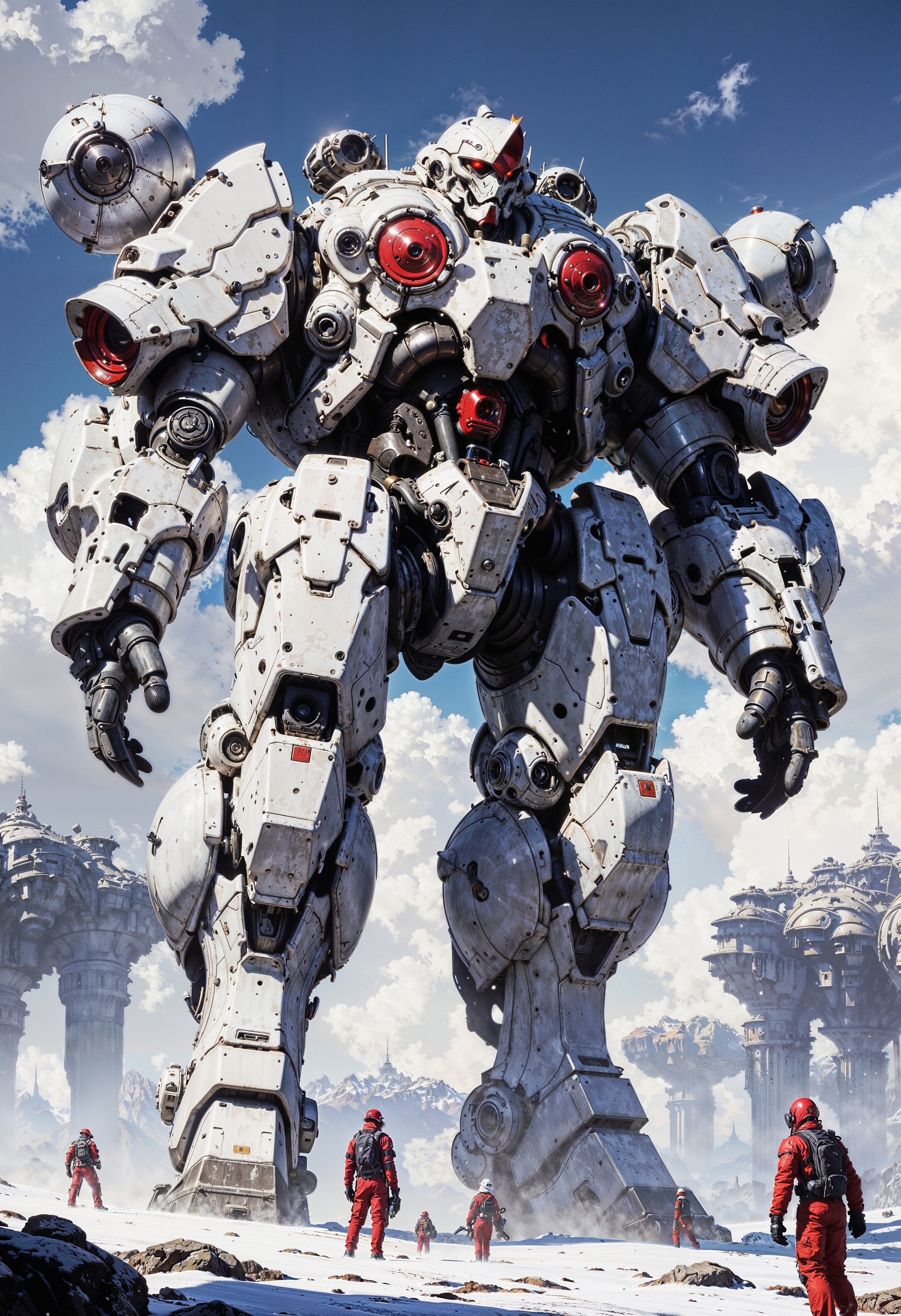 a highly detailed, futuristic digital artwork depicting a massive, towering mech in a sci-fi setting. The mech is primarily white with red accents, featuring large, spherical shoulder components and intricate mechanical details. It stands amidst a snowy landscape, surrounded by smaller figures in red spacesuits, suggesting a sense of scale and grandeur. The sky is a mix of blue and white, with additional large structures visible in the background, enhancing the futuristic theme. The composition is dynamic, with a low-angle perspective emphasizing the mech's imposing presence. The overall color palette is dominated by whites, reds, and blues, creating a stark contrast between the mechanical elements and the natural environment. <lora:FluxMythG0thicL1nes:0.6> <lora:RetroAnimeFluxV1:0.6> <lora:FredFraiStyle-FLUX-Share:0.6> <lora:dark_fantasy_flux:0.6>