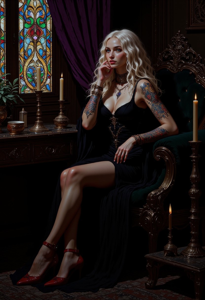 pinkdarkfantasy, This fantasy-style digital painting portrays a mysterious young woman with long, white curly hair, adorned with Her violet eyes, sharp features, and cool black lips exude charm. She wears a fitted black dress that accentuates her slender form, with a fishtail skirt and a black nylon pantyhose revealing her long legs. A bunch of detailed body tattoos, gothic inspired, obsidian and ruby intricate, adds rebellion to her dark attire. She rests on a black velvet sofa, with leather red high heels featuring embroidered straps. The dimly lit room is adorned with deep purple velvet curtains, a stained glass window casting colorful shadows, and ancient walnut furniture with flickering candles, creating an air of mystery.