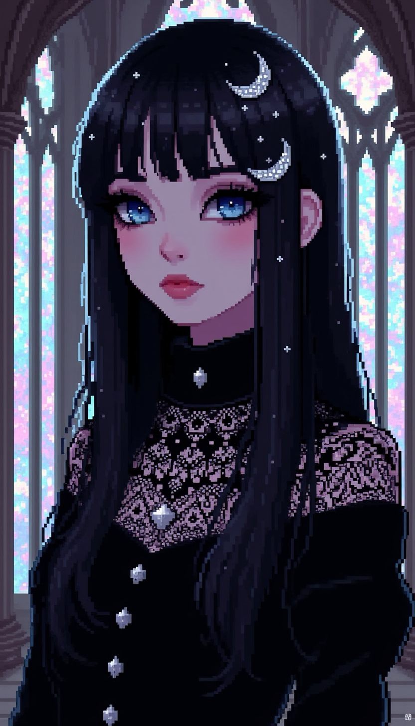 pinkpixelicious, A hauntingly beautiful woman with pale, flawless skin and piercing ice-blue eyes framed by dark lashes. Her long, sleek black hair is adorned with silver filigree clips shaped like crescent moons. She wears a high-necked black velvet gown with intricate lace detailing. The background reveals a dimly lit, grand gothic cathedral with towering stained-glass windows casting colorful shadows.