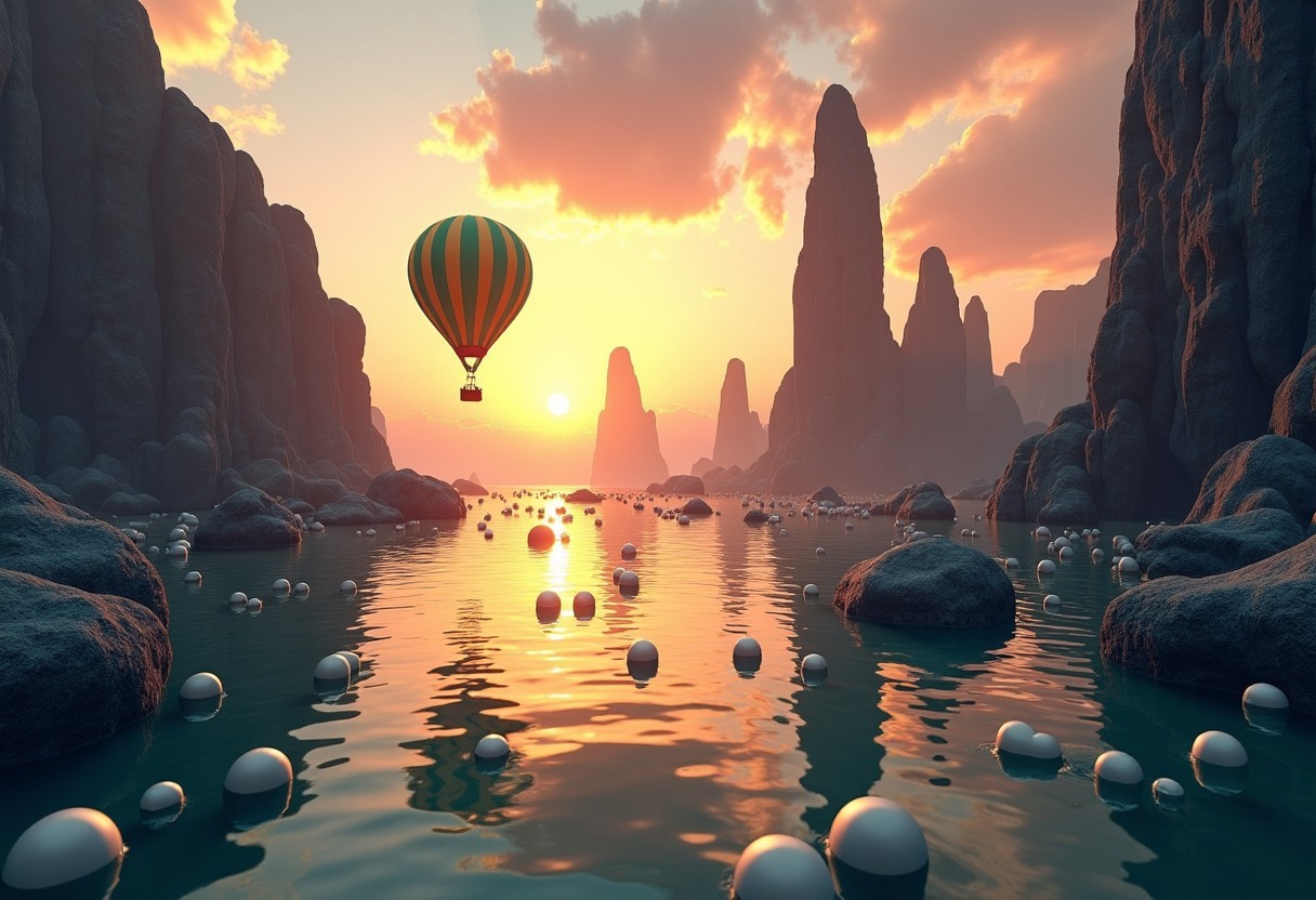 Tranquil seascape at sunrise, numerous tall, dark gray rock formations rising from a calm body of water. Many small, pearly-white bubbles float on the water's surface, reflecting the warm sunset colors. A large hot air balloon, green and gold, floats serenely in a vibrant sky of fiery orange, pink, and light clouds. The rocks are various sizes and shapes, some with natural arches, creating a sense of mystery and vastness. The perspective is from slightly above the water's surface, emphasizing the reflective quality of the water and the multitude of bubbles. Colors are rich and saturated, showcasing a blend of sunset hues and deep blues of the water, with gentle gradations. Smooth rock textures contrast with the water's reflective surface and gentle ripples. The mood is serene, peaceful, and contemplative, evoking a sense of wonder and tranquility. Surrealist, digital painting style. High dynamic range. Atmospheric perspective.
