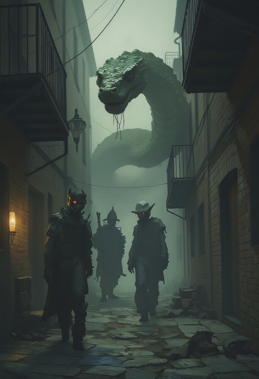 comic art by Mike Allred, style of Ted Nasmith, A dimly lit alleyway shrouded in fog, where a large, serpentine creature with multiple heads slithers between the shadows, its scales shimmering in the faint light, as masked figures in strange, armored suits cautiously follow it, their weapons at the ready, in the style of analog VHS aesthetic, grainy and low-resolution, muted retro color palette, soft focus with heavy shadows, eerie and unsettling atmosphere, surreal and nostalgic, vintage cult-like vibe, dark and shadowy environment, washed-out colors Caravaggio meets D&D charm , masterpiece, art by torikun, SentinelBot, OBxiaoxiang