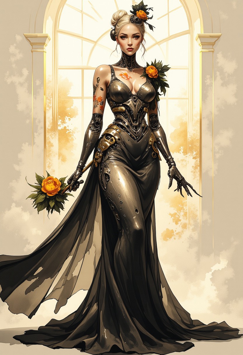 Beautiful female cyborg in the style of marilyn monroe Wild platinum-blonde Futuristic and Vintage stylized extraordinarily beautiful, babe, , modern girl with tattoos dressing vintage, 1920s style clothing , imaginatively 20's stylized dress, , magical, alluring, sultry, full-length, female-body, hazel-eyes, eye catching, bright, , Magical beautiful background fantasy, perfect face and eyes, hyper-detailed hypermaximalist dynamic style AliceWaifu, , skin texture style, realism, detailed, Slender shapely female-body glowing sheer silky Dramatic lighting Cinematic Epic composition Magical background ArsMJStyle, Zen Ink Wash Sumi-e bo-golden White background reij-cybersteam, steampunk, asian, cyberfuturistic, futuristic steampunk, robotic elegance, mechanical aesthetic, cyberdoll details, dim lighting, bokeh effect, asian architecture cyberpunk