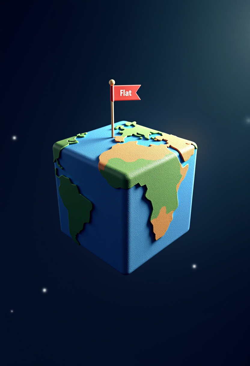 Earth as a 3d cube in space with a small flag that says "Flat"