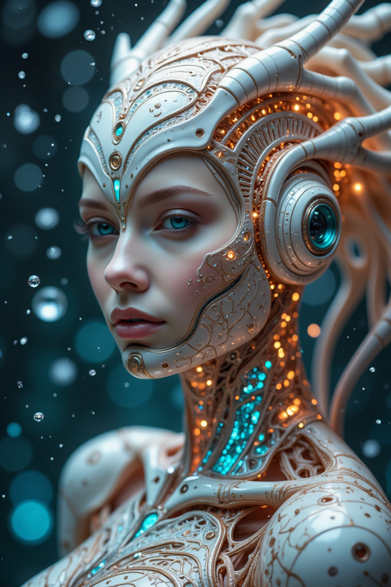 8k portrait of beautiful biomorphic full body stunning white porcelain cyborg with metallic hair in transparent brocade underbust corsage with lustful presence, (((holding a photo camera))), smiling, under water, intricate, elegant, highly detailed, majestic, broken glass, (masterpiece, sidelighting, finely detailed beautiful teal eyes: 1.3), hdr, photorealism, bokeh, neon elements, biomechanical interface. Intrincated detailed skin, futuristic, utopian, machine parts, body parts, wires, circuits, highly detailed, cinematic, look from above, hauntingly surreal, highly detailed and intricate, rich deep colors, intricate, masterpiece, golden ratio, intricate, epic, sweet, beautiful face, perfect eyes, perfect proportions