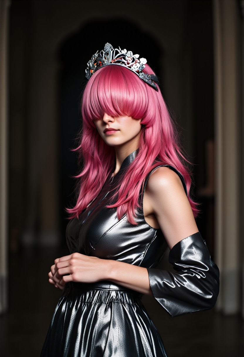 ajchrobo, a monochrome Upper Body Closeup Portrait of a Princess Woman in high glossy reflecting metallic japanese Maid inspired dress, bleaked neon colorful pink beige Hair shading the eyes, Hair over eyes, ajhafa, monochrome with Colorful Highlights, Standing infront an old DARK Gothic mansion