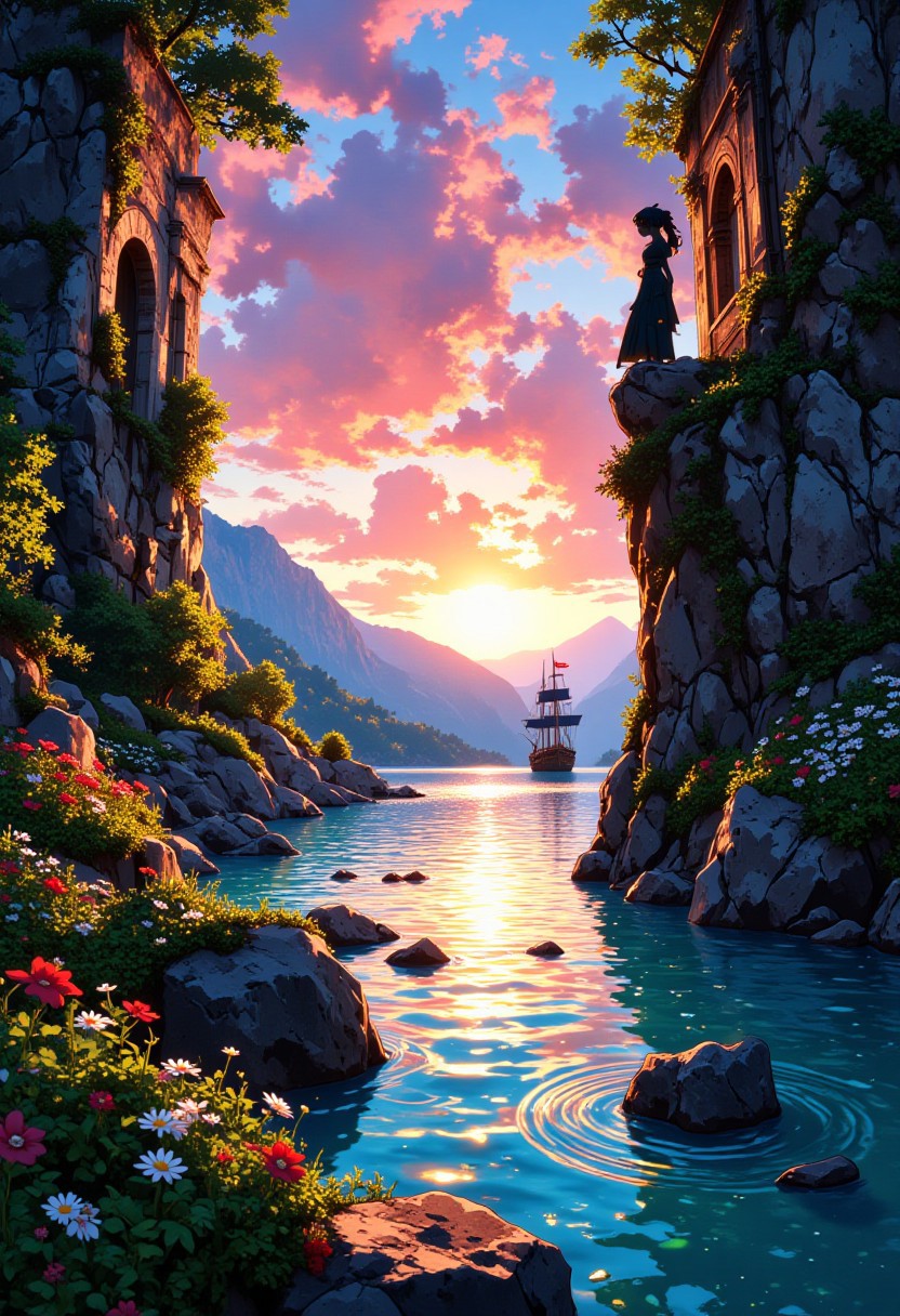 Vibrant and dynamic illustrations and vectors, a picturesque,Sculpture from a rock (full-length), a female silhouette is visible from the rock wall, the female silhouette organically merges with nature (lightly covered with dark moss and vegetation), a lagoon, In the distance you can see a pirate ship with black sails afloat, (pirate ship:1.1 ), stone ruins Mountains, waterfalls, flowers, forests, sunrise, dynamic composition, digital painting, Studio Ghibli-inspired, cozy lighting, whimsical atmosphere, by Junji Ito and Hayao Miyazaki, artstation trending, 4k resolution. Masterpiece.