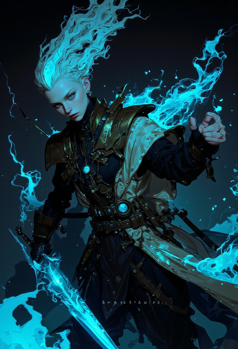 A hyper-detailed portrait of JunjiIto.hanna, featuring long silver hair styled in fragmented, floating strands, exuding a cold, enigmatic aura. Her eyes glow ice-blue, pupil-less, staring blankly with a detached expression. She wears avant-garde, biomechanical armor with oxidized bronze and iridescent blue details, layered over a flowing techno-kimono with translucent silk and circuit-like embroidery. Her overcoat is sleeveless, with jagged crystalline edges and glass-textured fabric, creating a surreal silhouette. She draws a translucent plasma-forged blade emitting ethereal cyan particles and vapor trails, suggesting silent spectral motion. Her biomechanical ornaments blend ancient motifs with futuristic cyber elements. The background is a deep gradient of electric blue fading to black, enhancing the surreal, cybernetic atmosphere. The scene is captured from a high-angle perspective with a 100mm virtual prime lens, f/1.8 aperture, ISO 25, extreme shallow depth of field, emphasizing her spectral, otherworldly presence. Dramatic shadows and holographic grain overlay add texture and tension. Inspired by Junji Ito’s unsettling style, this moment is frozen in a dreamlike, suspended horror. (mythp0rt, ne0nfant4sy, midjourney_whisper_avant_couture)