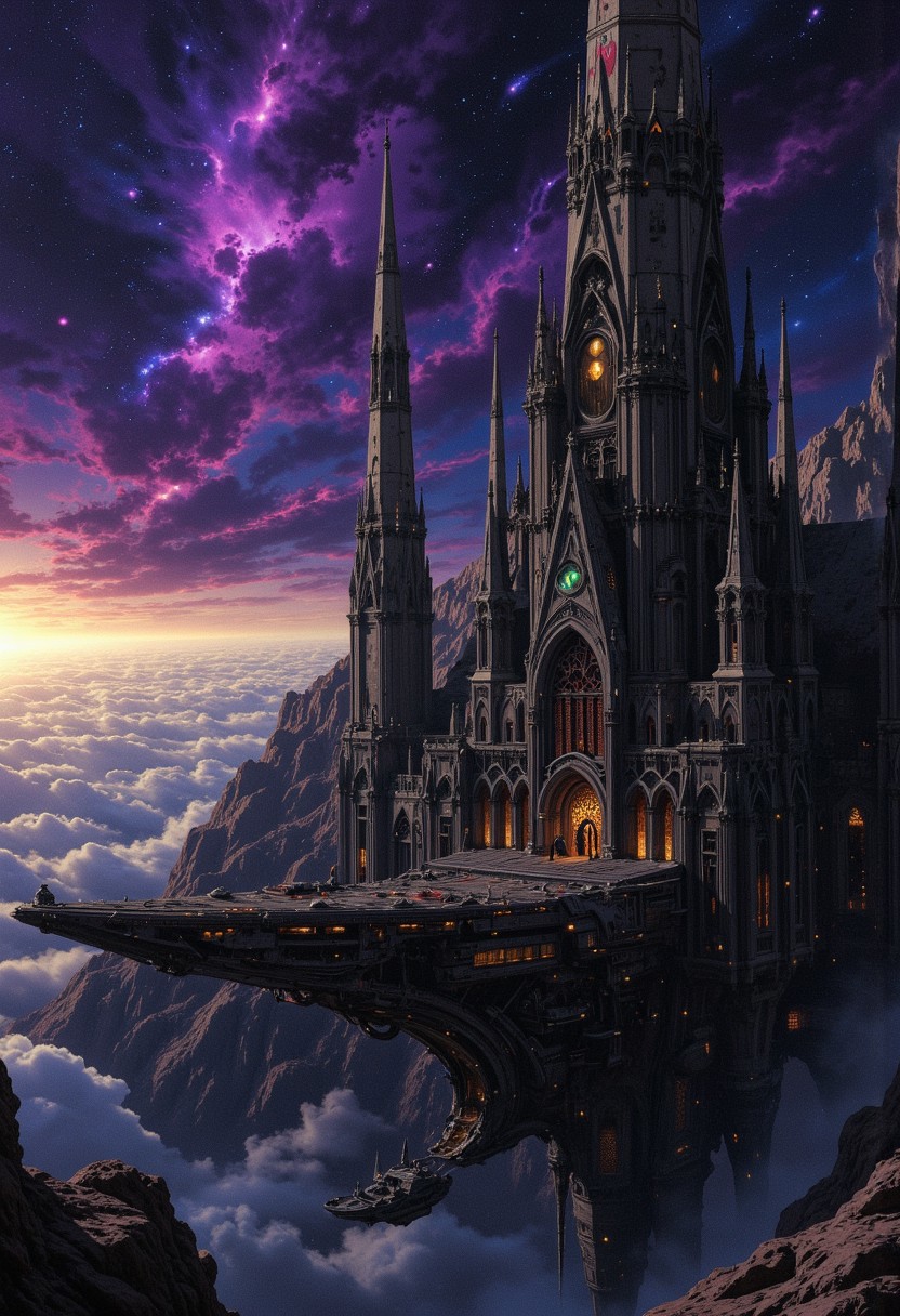 (Masterpiece, ultra-realistic, 32k, best quality, hyper-detailed, cinematic lighting, reversal film photography, film grain, intricate textures, photorealistic, dramatic composition, immersive depth, trending on ArtStation.) (A colossal space battle cruiser drifts silently through the vast interstellar void, its gothic-mechanical architecture an awe-inspiring fusion of sci-fi and medieval grandeur. Byzantine palace-cathedral elements dominate its structure, towering spires reaching skyward, adorned with fluttering banners that ripple against the cosmic expanse.) (Shattered stained-glass windows scatter soft white and purple sunrise rays through the dust-filled corridors, illuminating the cybernetic decay woven into its divine yet eerie design. Embers drift weightlessly in the solemn silence, a haunting echo of forgotten wars and ancient faith.) (A dynamic wide-angle shot, with volumetric lighting, deep atmospheric contrast, and high cinematic tension, evoking a sense of solemn reverence and otherworldly power.) <lora:Hand v2:0.5> <lora:Anti-Blur:1><lora:Insane Detail Slider:0.25> <lora:flux.1_lora_flyway_Epic-detail_v2:0.3> <lora:fluxenhancer:0.25> <lora:Anime_style:0.6> anime style
