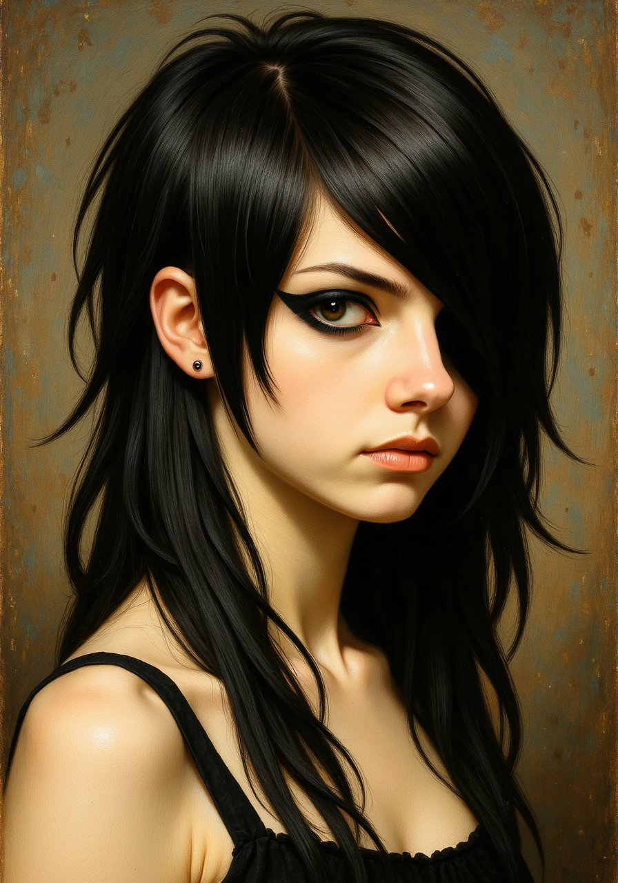renaissance oil painting of a young woman in a victorian sleeveless dress She has a distinctive 2000s scene/emo haircut: thick, sharply angled bangs that sweep across one eye, with long layered strands and long sidelocks that drape in front of her shoulders. Her intense eyes are framed by bold black winged eyeliner.<lora:2000s_Scene_Emo_Hair.safetensors:1.0:1.0>