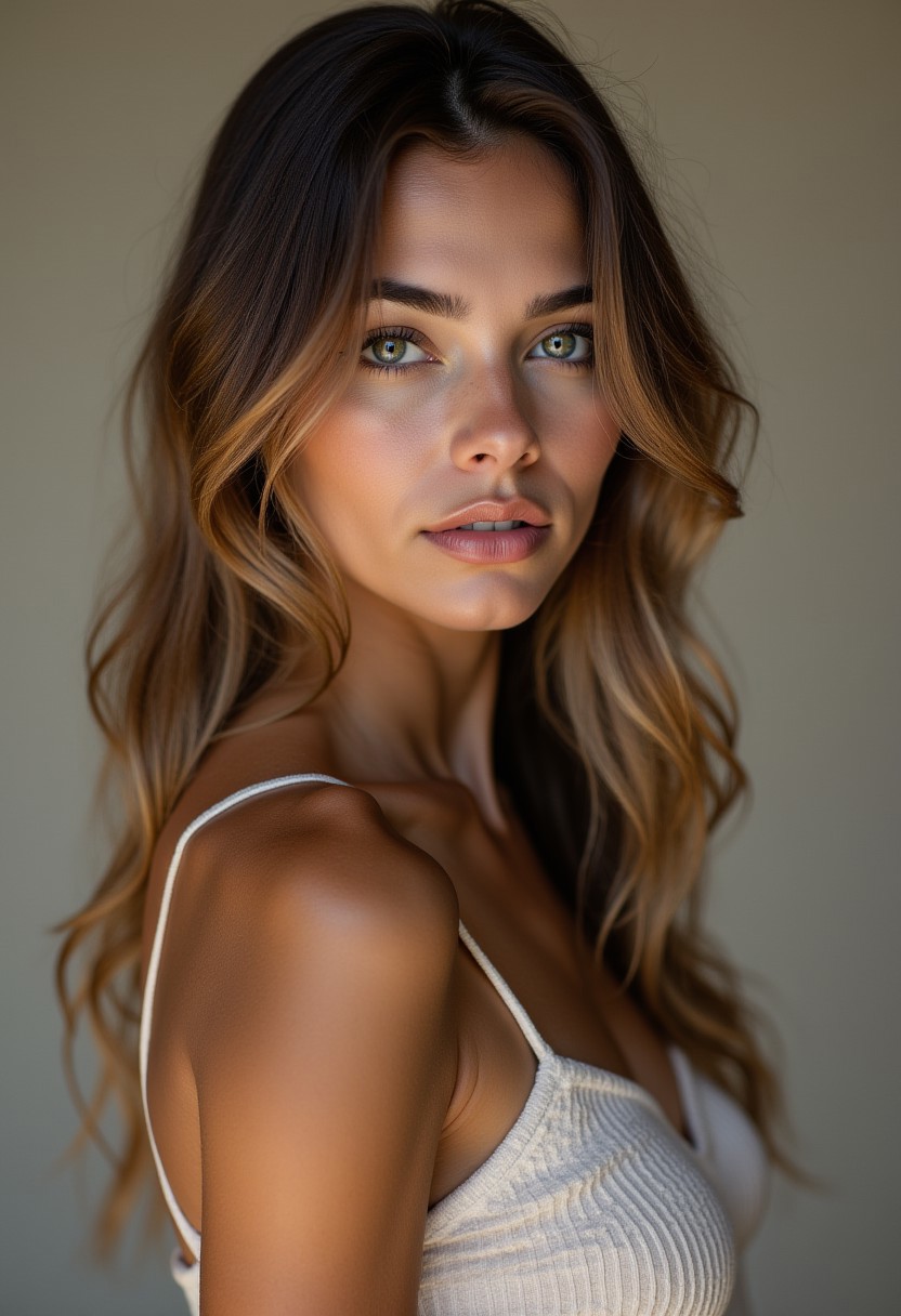 tall skinny supermodel looking softly at the viewer, fashionable clothing with a hint of innocence and grace