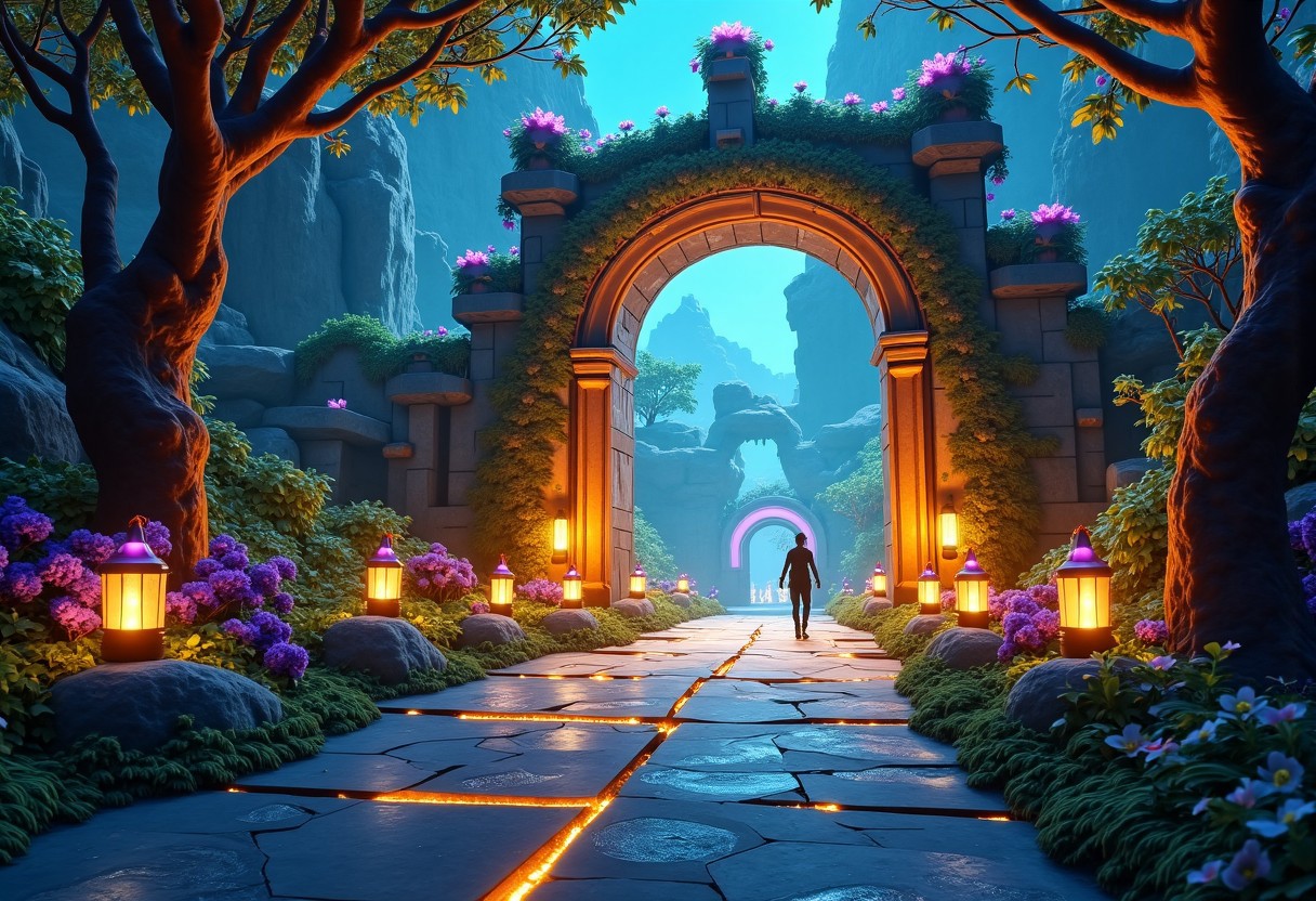 A hyper-realistic view from the main road leading into Aethermoor. The path is carved from smooth stone veined with glowing moss, lit from below in soft waves of cyan and gold. Before you towers the open village gate—an arch of braided rootstone and crystal, blooming with bioluminescent vines that shimmer in radiant blues, rose, and amber. The gate pulses faintly, alive to your presence. Beyond it, Aethermoor unfolds like a dream spun into matter—curved streets paved in prismatic glass-stone, stitched with lines of glowing gold. Homes rise in impossible shapes—some coiled like petals, others like towers of bent obsidian and bloomwood, their rooftops tiled in shifting opals that ripple color with every breath of wind. Floating lanterns drift overhead without string or fuel. Trees grow from rooftops, their branches arching over the walkways, leaves glowing softly in violet and honey-light. Music hums from unseen places—bells tuned to the breeze, voices laughing somewhere close. The scent of firefruit, spice, and misted nectar fills the air. Just ahead, a figure walks into the light of the village, silhouetted in gold. They pause—then look back. This place remembers who enters. And who dares to step further.