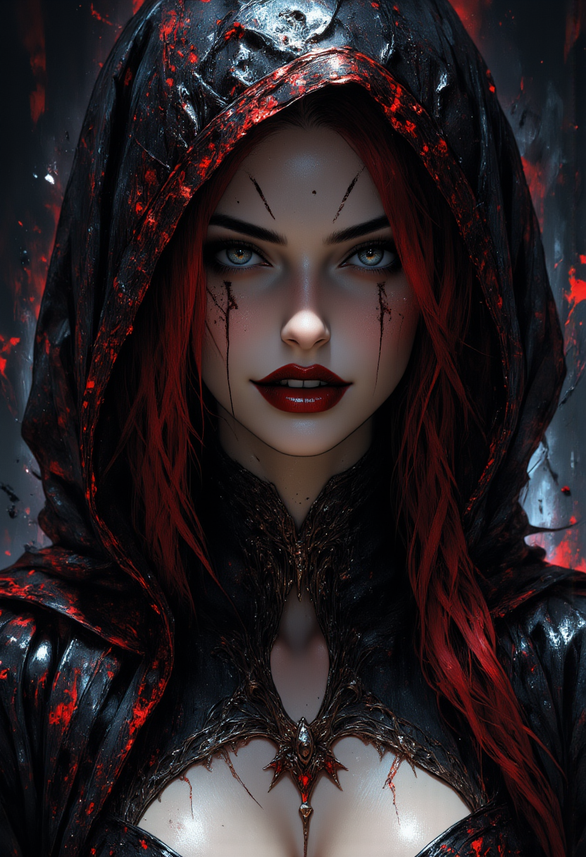 high quality, ultra detailed, colorful, abstract, fantasy, aidmaMJ6.1, a highly detailed, hyper-realistic digital painting depicting a close-up of a vampire woman's face, sultry apperance, seductive and beautiful, her mouth is slightly open, she has long dark red hair, partially obscured face, her face is adorned with a glossy, black hooded cloak that covers her head and shoulders, adding to the dark, eerie atmosphere, she wears a black, high-collared top with a plunging neckline, cleavage, the background is dark and out of focus, smokey background, focusing attention on her face and upper body, the texture of her skin is smooth and glossy, with a slight sheen, enhancing the realism of the artwork, the overall style is dark fantasy and gothic, blending elements of horror and fantasy art with a touch of realism,