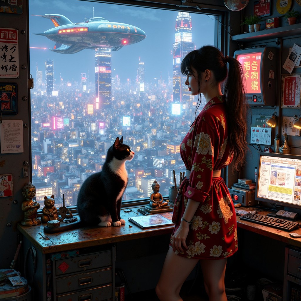 black cat with a white neck and white feet is sits on a cluttered metal riveted desk next to a maneki neko statue and small bronze buddha, the cat is looking out to a floor to ceiling window that looks out over a futuristic cyberpunk Tokyo skyline with skyscrapers and futuristic airships covered with lights and advertisements in Japanese, a tall thin beautiful young woman, 22 years old, is standing next to the cat looking out at the city through the window, The woman is dressed in an ornate short japanese style bath robe, exposing her long legs. The woman's hair is messy from just waking up. Artistic cyberpunk, dynamic perspective,