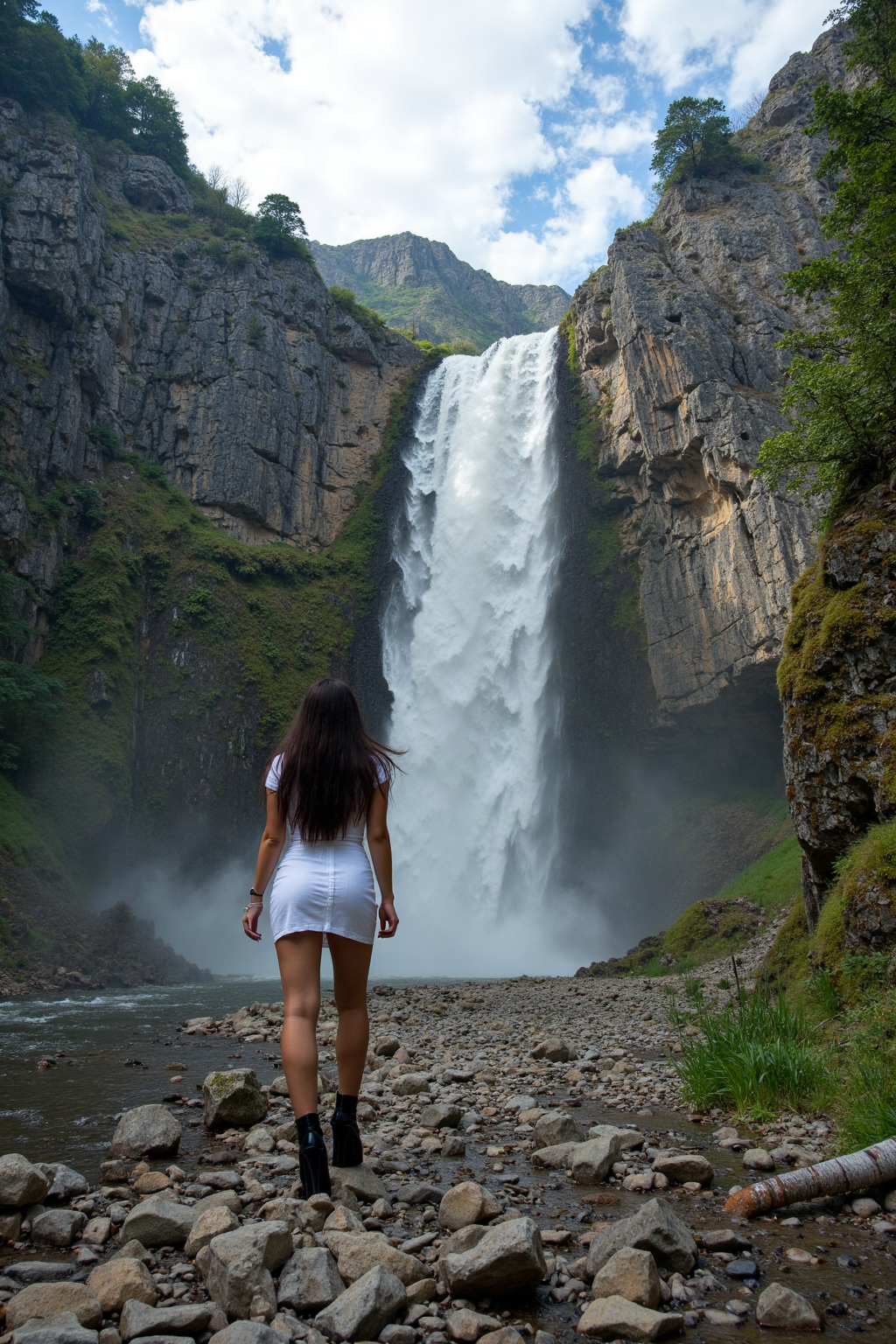 photo of woman in f3mLowAngle. we see long legs in low angle view. The woman wears a short skirt. a waterfall off a mountain extremely detailed, ideal for wallpaper art